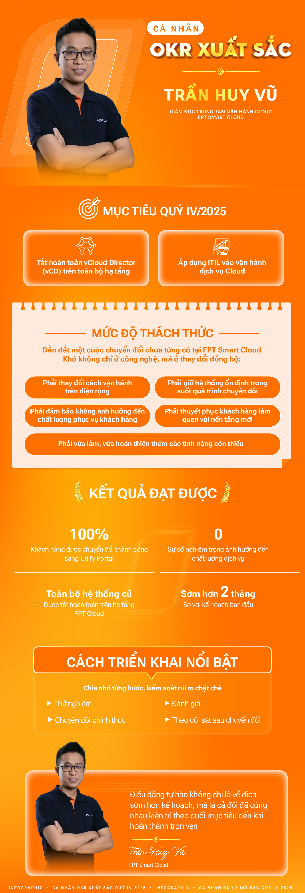 Với mục tiêu chưa từng có tiền lệ tại FPT Smart Cloud, Trần Huy Vũ đã cùng team dẫn dắt chương trình chuyển đổi quy mô lớn, đưa 100% khách hàng sang nền tảng mới, hoàn thành sớm 2 tháng và vẫn giữ vững chất lượng dịch vụ. Thành tích này đã giúp anh trở thành cá nhân OKR xuất sắc quý IV/2025.