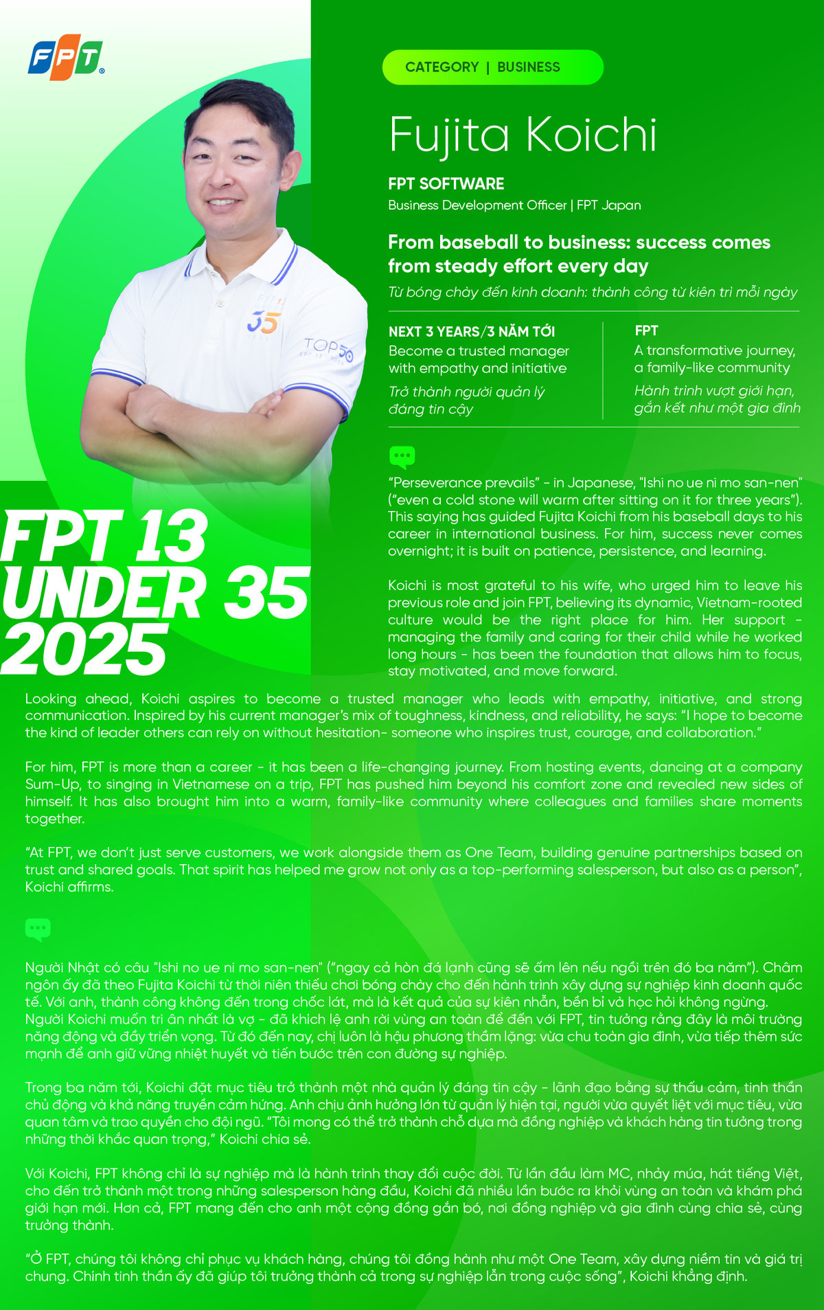 Thứ ba, 26/8/2025 | 09:34 GMT+7Với Fujita Koichi, thành công đến từ sự kiên trì, và FPT đã tạo ra hành trình đầy ý nghĩa giúp anh bước khỏi vùng an toàn.