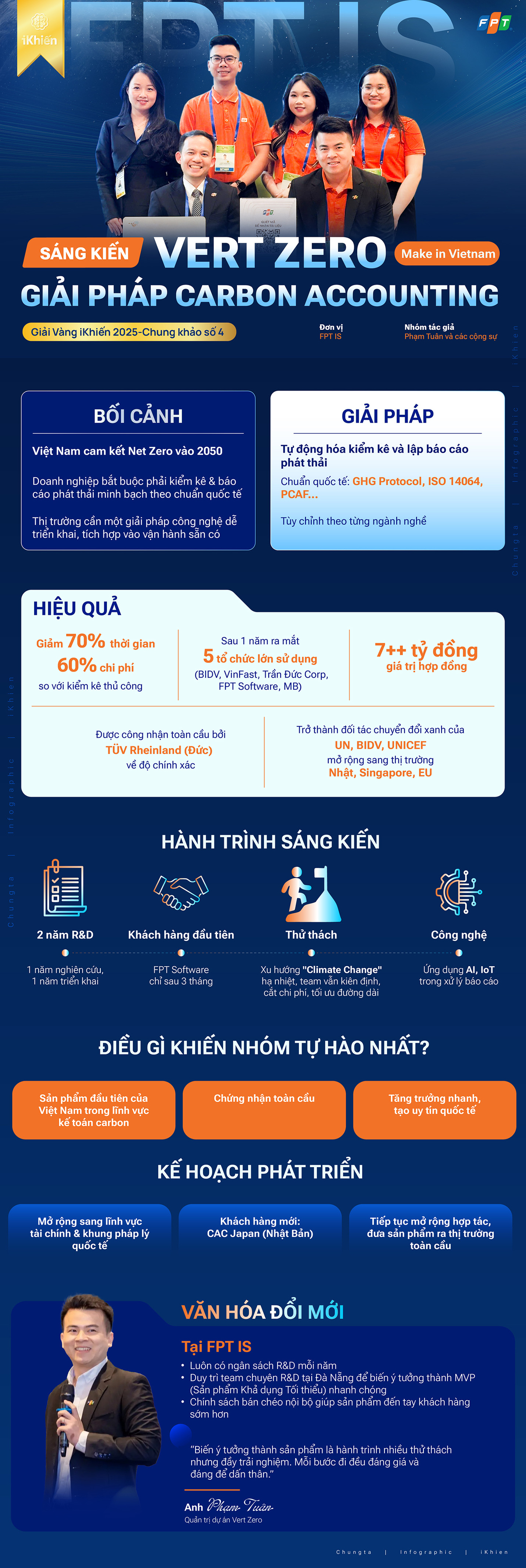 Ra đời trong bối cảnh Việt Nam hướng tới mục tiêu Net Zero 2050, Vert Zero - nền tảng kế toán carbon do FPT IS phát triển - giúp doanh nghiệp tự động hóa kiểm kê và báo cáo phát thải theo chuẩn quốc tế đã mang về giải Vàng chung khảo số 4 - iKhiến 2025, khẳng định vị thế tiên phong của FPT trong công nghệ xanh “Make in Vietnam”.