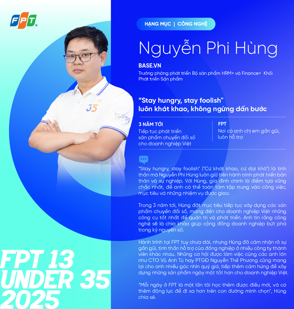 Thứ ba, 26/8/2025 | 09:34 GMT+7Nguyễn Phi Hùng chọn tinh thần “stay hungry, stay foolish” để tiếp tục đưa sản phẩm Made by FPT chinh phục thị trường, giúp doanh nghiệp Việt Nam vươn tầm.