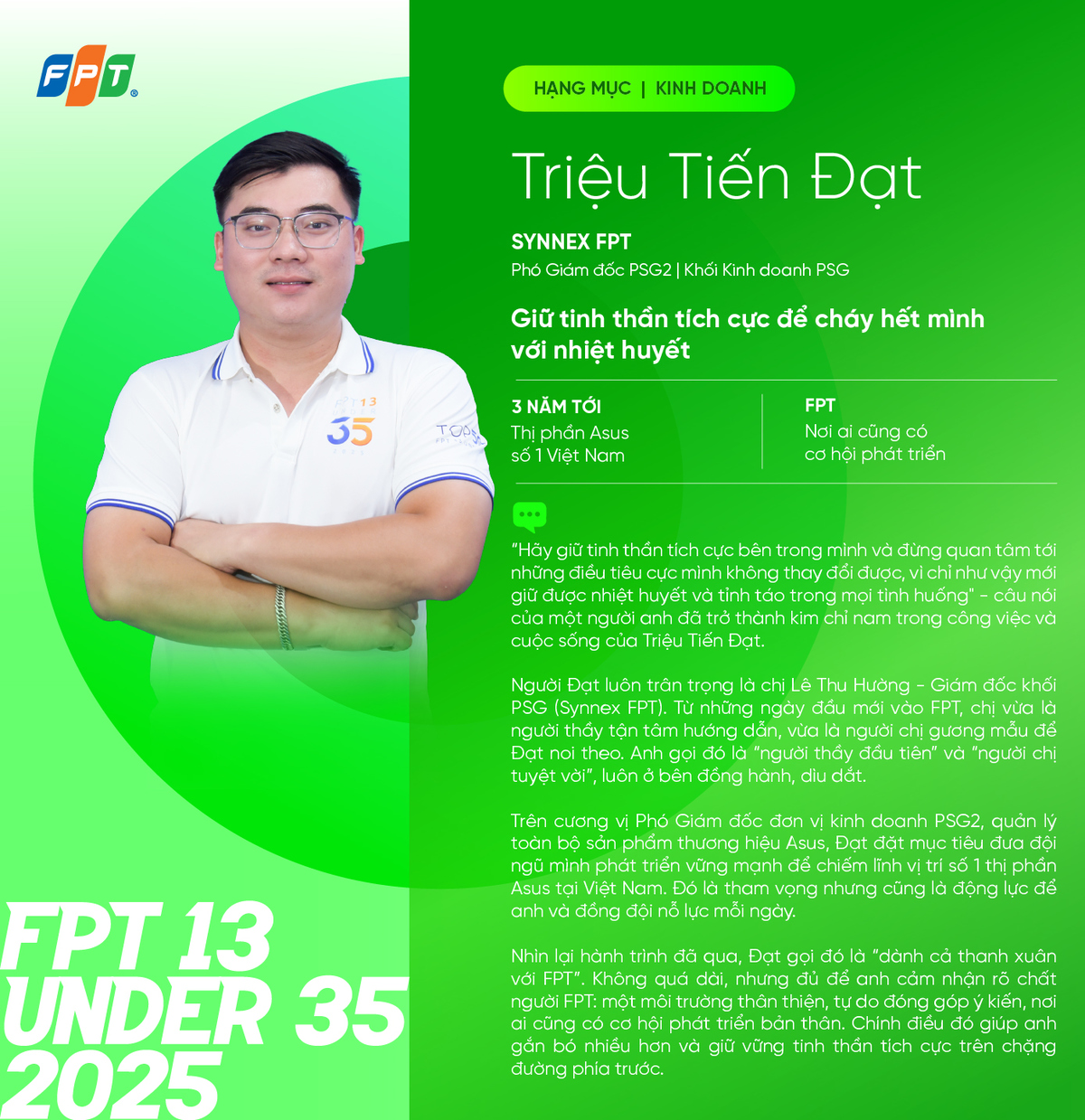 Thứ ba, 26/8/2025 | 09:34 GMT+7Triệu Tiến Đạt mang trong mình khát vọng vươn xa trong kinh doanh và quyết tâm cháy hết mình cùng đội ngũ.