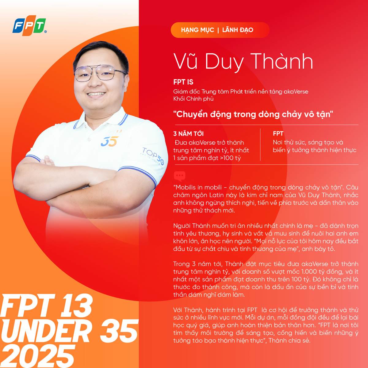 Thứ ba, 26/8/2025 | 09:35 GMT+7Giám đốc akaVerse đặt mục tiêu nghìn tỷ cho trung tâm trong 3 năm tới. Với anh, FPT như một dòng chảy sáng tạo bất tận để thử thách và bứt phá.