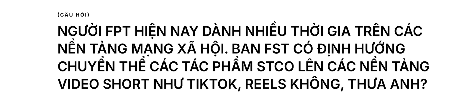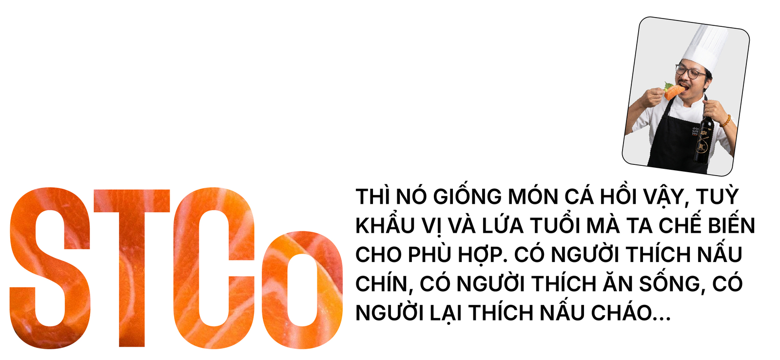 STCo thì nó giống món cá hồi vậy, tuỳ khẩu vị và lứa tuổi mà ta chế biến cho phù hợp. Có người thích nấu chín, có người thích ăn sống, có người lại thích nấu cháo… FPT giờ đã có đến 3 thế hệ đang cùng làm việc, chúng ta không thể ép thế hệ này phải ăn theo khẩu vị của thế hệ khác được. Do vậy, cũng phải mất công chế biến một chút.