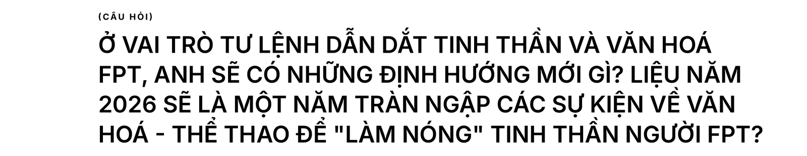 Về thể thao, các môn Thể thao điện tử chắc chắn sẽ được đẩy mạnh trong năm nay. Tôi dự tính tổ chức các giải eSport, chiếm tỉ lệ từ 40% số hoạt động trở lên. Bởi, eSport có thể chạm đến mọi nơi mà không cần sân bãi vật lý. Thiết bị thì anh em nào cũng có. Ta có thể tổ chức đủ môn: Cờ tướng, Liên Quân, PUBG hay Bóng đá ảo. Thậm chí có thể tổ chức World Cup eSport kết nối anh em toàn cầu. Hãy biến văn phòng thành chiến trường eSport, tổ chức gọn trong 1-2 ngày cuối tuần. Mục tiêu cuối cùng của thể thao FPT là kết nối anh em chứ không phải đào tạo vận động viên chuyên nghiệp.