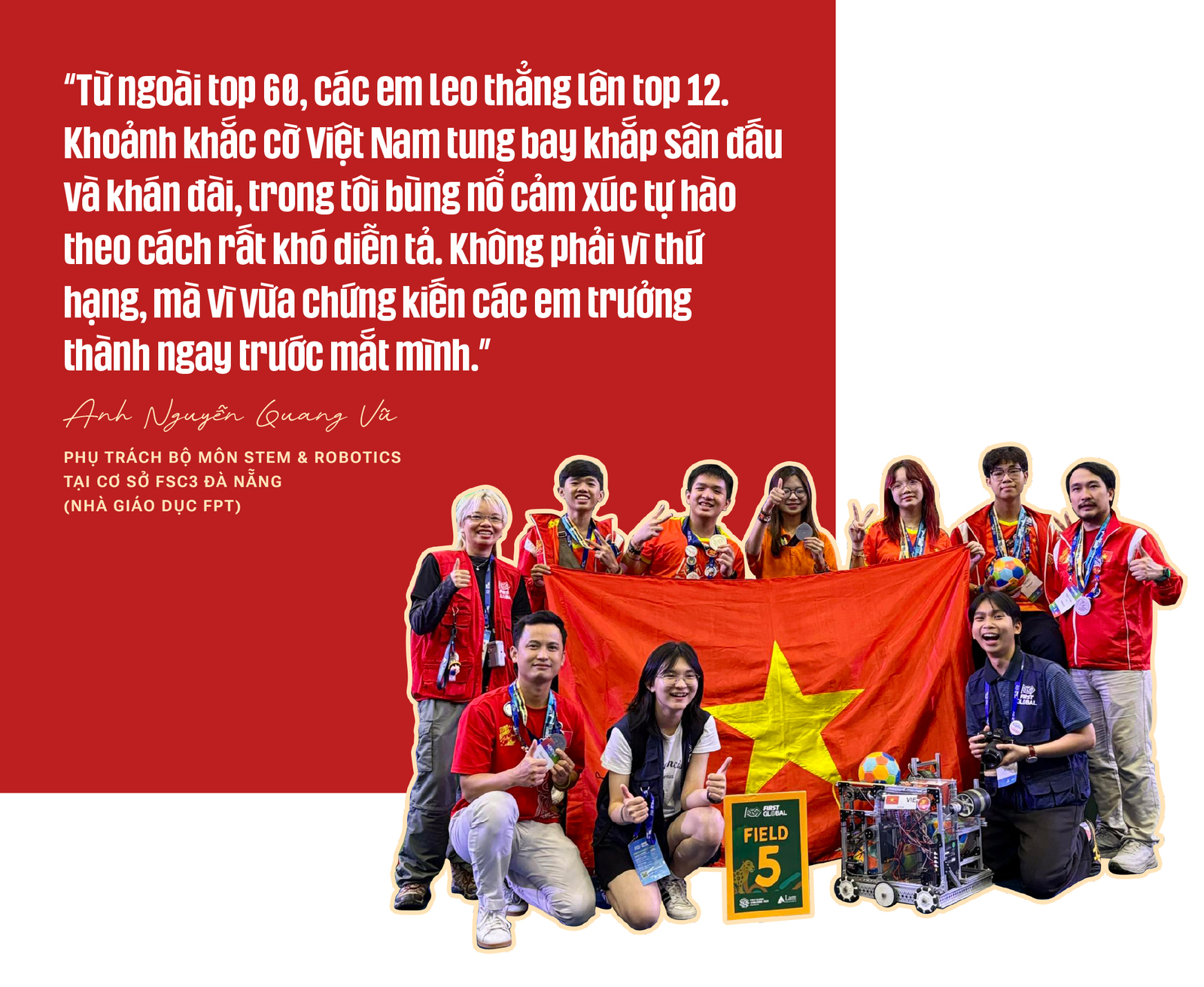 Từ ngoài top 60, đội leo thẳng lên top 12. Vào vòng chung kết. Và lá cờ đỏ sao vàng tung bay vừa dưới sân thi đấu, vừa trên khán đài. "Tôi đứng đó, thấy tự hào theo một cách rất khó diễn tả. Không phải vì thứ hạng. Mà vì vừa chứng kiến các em trưởng thành ngay trước mắt mình".