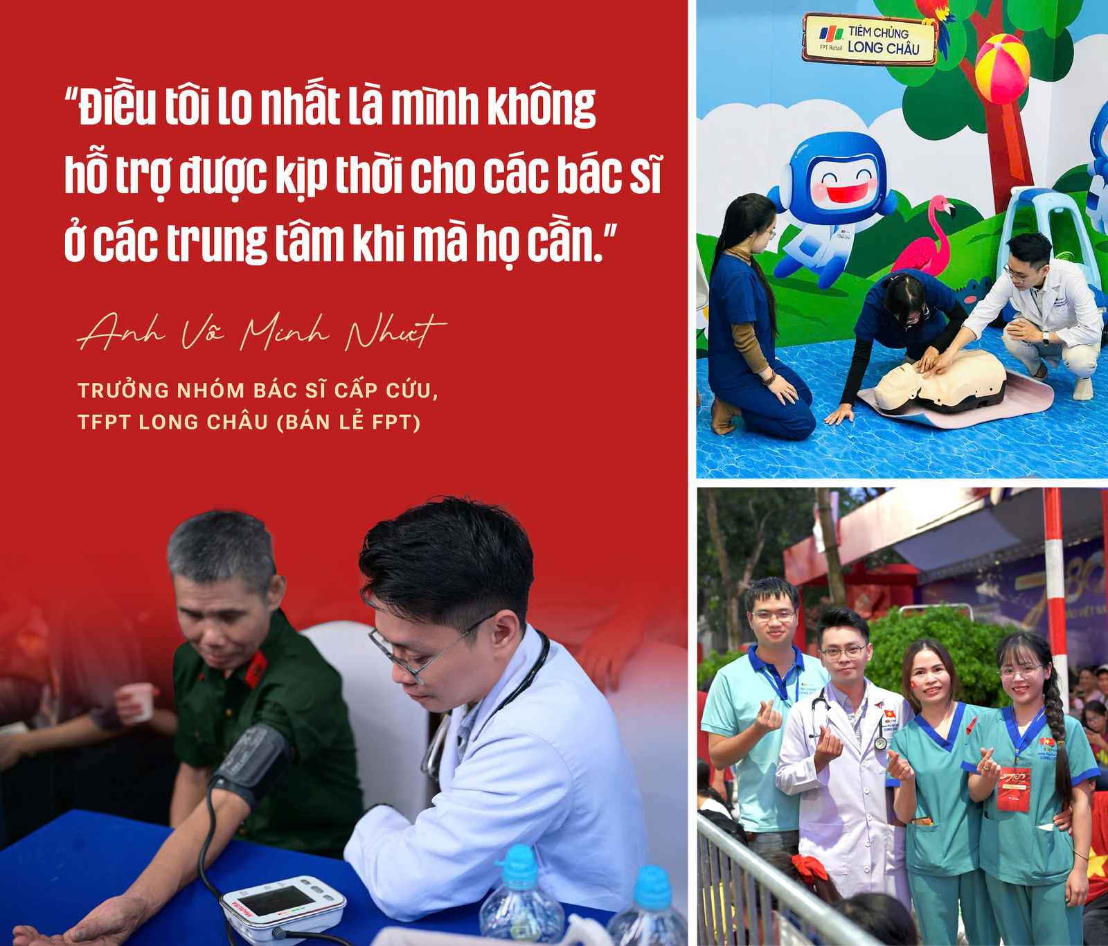 Bác sĩ Võ Minh Nhựt cũng không có khái niệm nghỉ lễ trọn vẹn. Anh Nhựt là Trưởng nhóm Bác sĩ Cấp cứu của hệ thống tiêm chủng Long Châu (Bán lẻ FPT) gồm 230 trung tâm trải khắp cả nước, mỗi ngày có hàng nghìn mũi tiêm được thực hiện. Và phía sau mỗi mũi tiêm đó là một hệ thống hỗ trợ mà người dân không nhìn thấy: tổng đài cấp cứu 85555 trực 24/7, đội bác sĩ online sẵn sàng trong vòng 5 phút, ba tầng xử trí từ cơ sở đến chuyên gia Đại học Y Dược TP HCM.