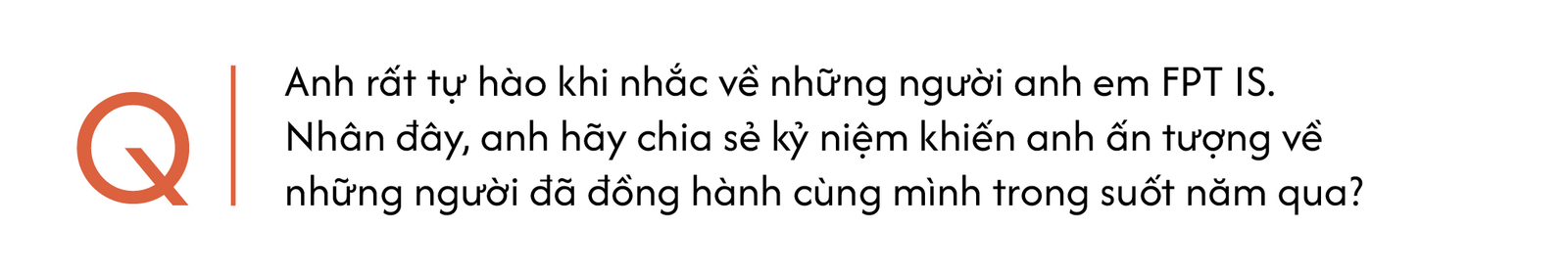 Con người FPT IS rất tình cảm, gắn bó với nhau như gia đình. Chính tinh thần ấy đã giúp chúng tôi vượt qua nhiều giai đoạn khó khăn. Vậy thì khi thành công, tôi mong mỏi chúng ta vẫn tiếp tục giữ sự đoàn kết đó, tinh thần đó để FPT IS đi nhanh, đi xa trong kỷ nguyên mới.