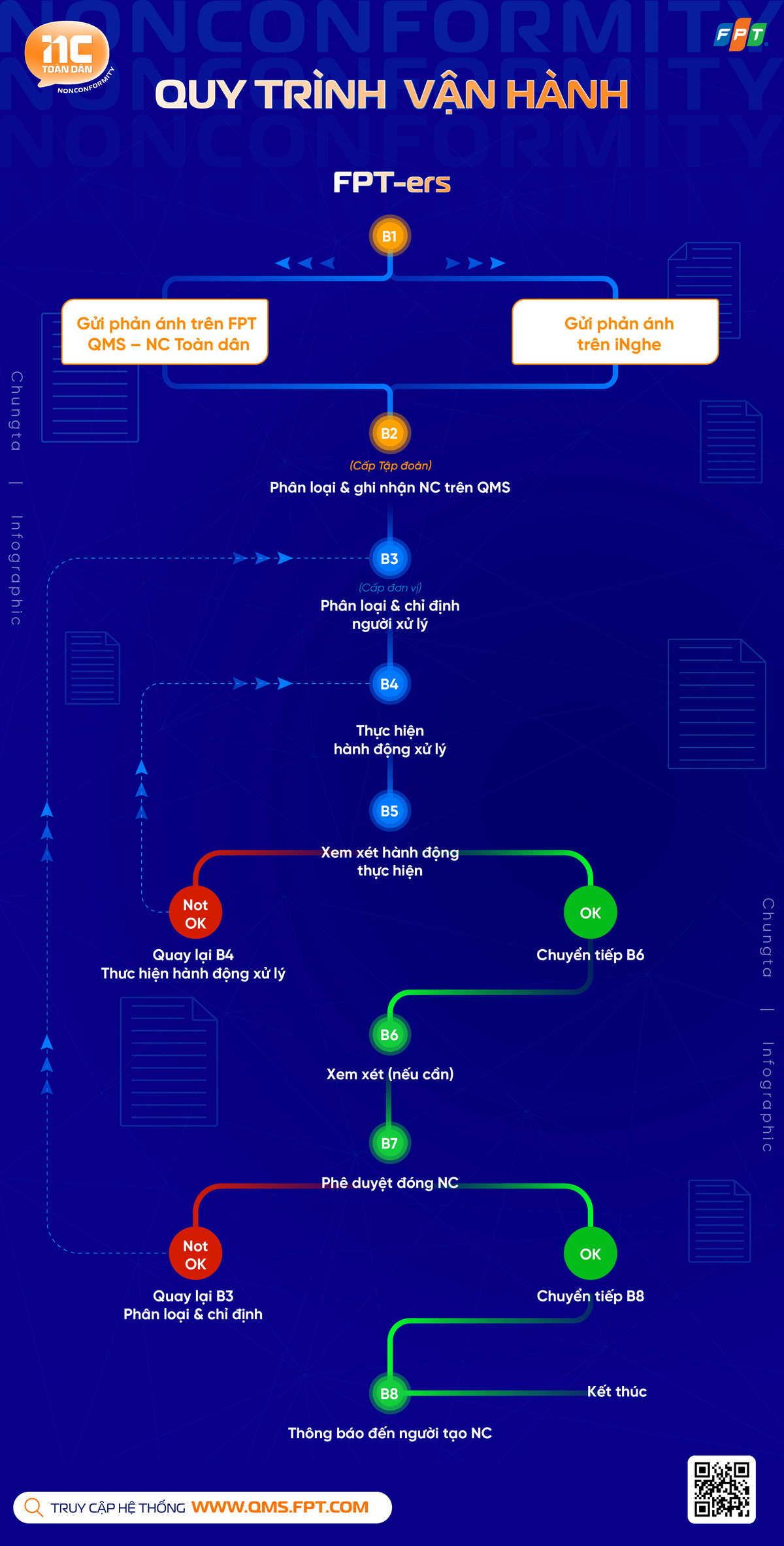 Với phương châm “Mỗi CBNV là một đánh giá viên nội bộ”, FPT khuyến khích mỗi CBNV sử dụng tính năng “NC toàn dân” trên hệ thống QMS.FPT.COM khi phát hiện bất cập hoặc trải nghiệm không tốt, muốn cải tiến về tuân thủ, các quy trình, quy định trong quá trình làm việc,...