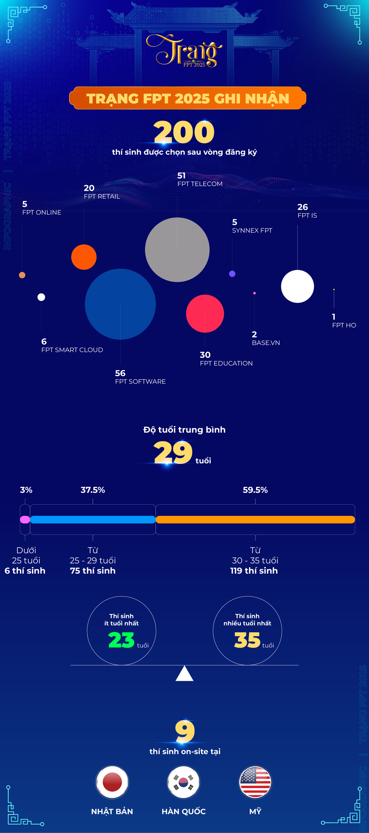 Nếu như cuộc thi Trạng mùa trước chủ yếu là sân chơi của những nhân sự đã có thâm niên (nhóm tuổi 30-35 từng chiếm tới 75,6%), thì mùa 2025 chứng kiến sự dịch chuyển mạnh sang thế hệ trẻ. Với số tuổi trung bình của thí sinh năm nay giảm xuống còn 29, tỷ lệ người trong độ tuổi 25-29 tăng từ 23,92% lên 37,5%. Nhóm dưới 25 tuổi cũng tăng từ chỉ 1 thí sinh ở mùa trước lên 6 thí sinh trong năm nay, với thí sinh trẻ tuổi nhất là 23. Điều này phản ánh tinh thần, khát vọng vươn mình của thế hệ trẻ FPT khi có nhiều người bước ra khỏi vùng an toàn, dám thử thách bản thân thông qua một cuộc thi giàu tính chuyên môn và sức ép như Trạng FPT.
